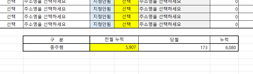 이 경우 전월의 (여기서는 6월) 엑셀의 누적 거리를 7월 전원 누적거리를 입력하여 줍니다,