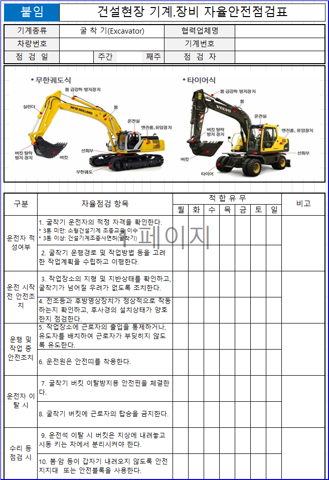 모든 장비는 건설기계안전관리 기준에 맞춰 운전자 자격, 법정검사, 작업 전·중·후 점검사항을 포함하고 있으며, 건설기계자율안전점검표 형식으로 바로 출력·작성할 수 있습니다.