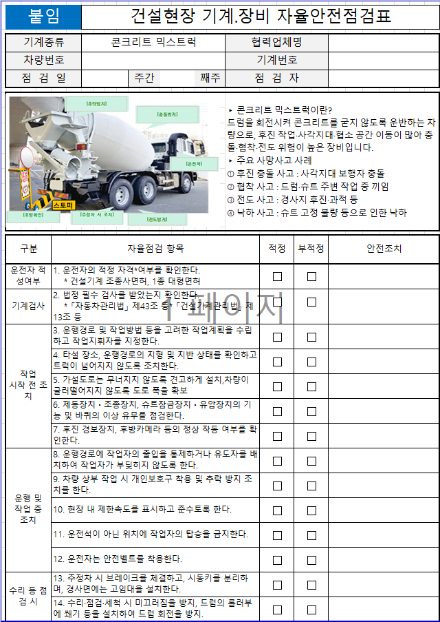건설기계자율안전점검표는 사고가 발생한 후를 대비하는 문서가 아니라, 사고를 사전에 막기 위한 도구입니다. 건설현장안전점검과 중대재해예방을 실질적으로 실천하고자 한다면, 이 자료는 반드시 필요한 기본 자료가 될 것입니다.