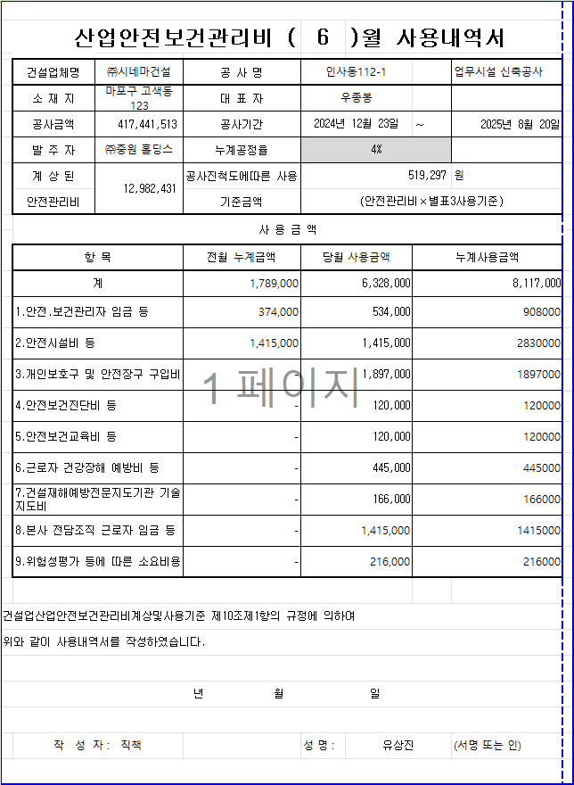 특히 근로감독이나 산업안전보건법 관련 점검 시, 안전점검엑셀로 체계적으로 관리된 기록은 현장의 신뢰도를 크게 높여줍니다.