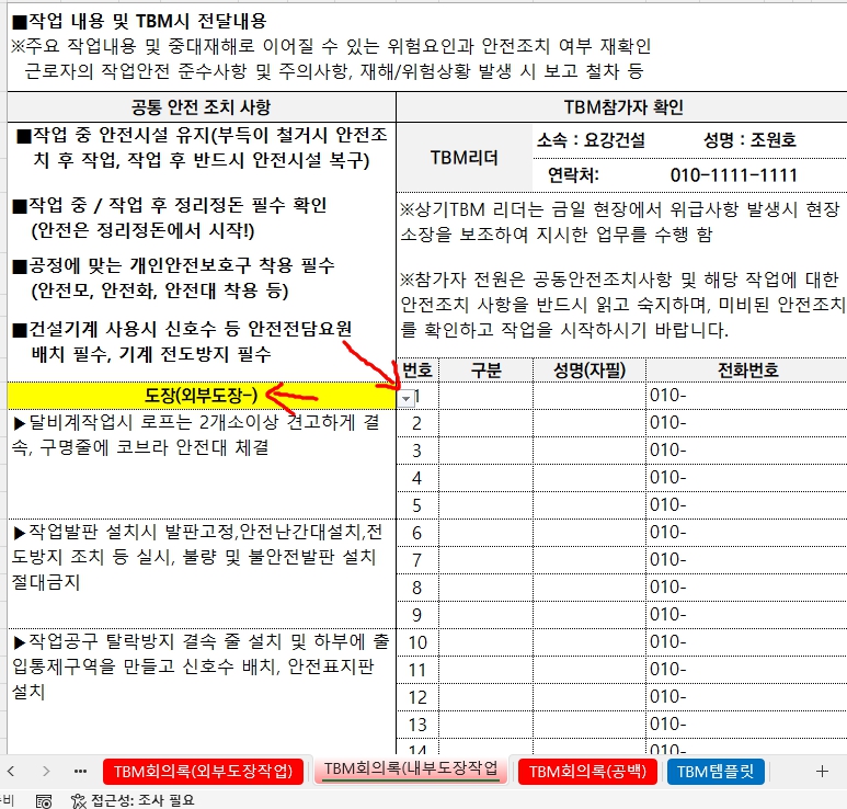 2)아랫쪽 "TBM템플릿" 시트를 선택하여 필요한 내용들을 입력해 둔다.