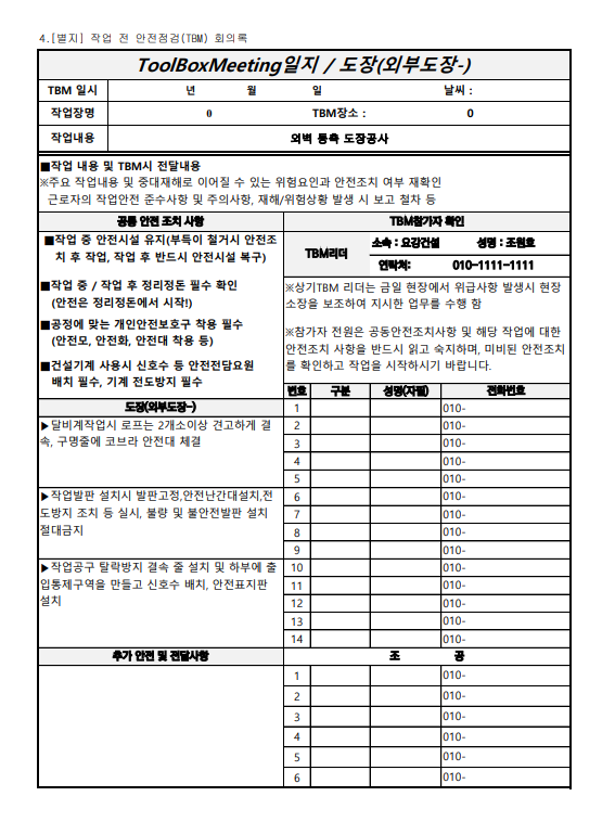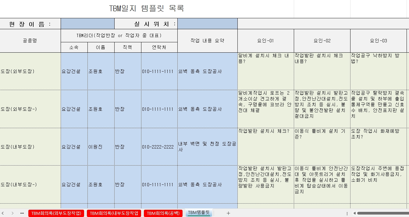 아래 엑셀을 이용하여 TBM일지를 작성하여 보시기 바랍니다.