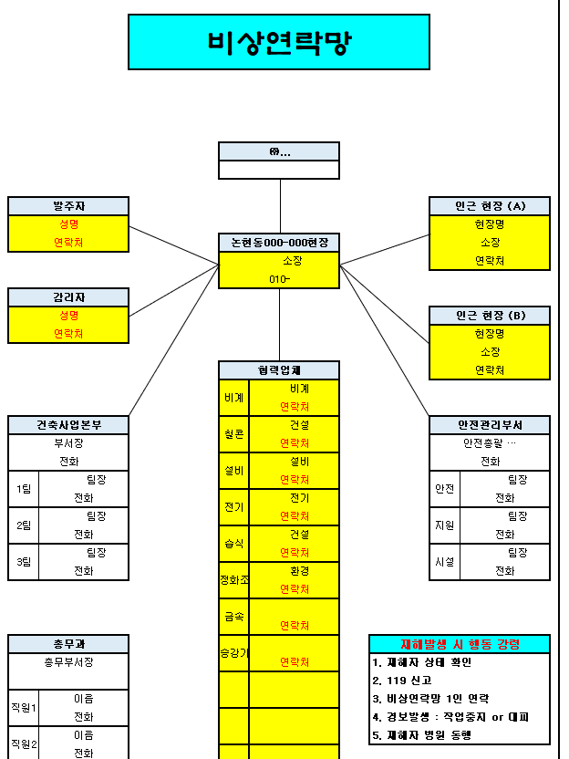 관련 법령: 산업안전보건법에 따라, 건설 현장에서는 비상 연락망을 작업장 주요 구역에 반드시 부착해야 합니다.