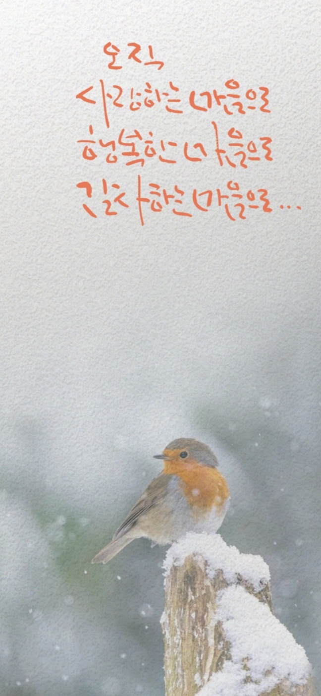 이미지의 글귀와 새는 조화롭게 어우러지며, "사랑과 행복, 긍정적인 내일을 기다리는 마음"이라는 따뜻한 메시지를 전달합니다. 차가운 겨울 배경 속에서도 꼬까울새의 생동감과 글귀의 희망적인 내용은 보는 이들에게 위로와 용기를 북돋아주는 느낌을 줍니다.