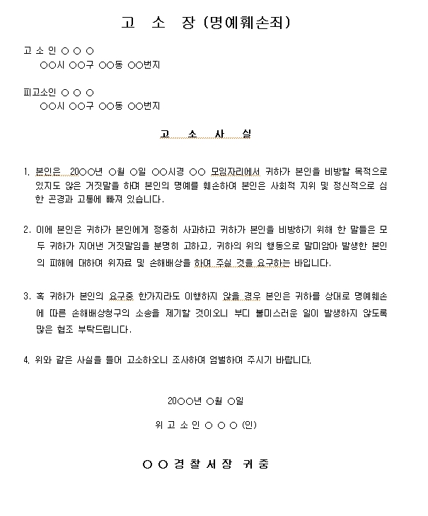 - 저는 본 고소장에 따라, ○/○/20○○에 ○○시 ○○에서의 모임에서, 피고소인이 제 명예를 훼손하기 위한 목적으로 없던 거짓말을 하고 제 명예를 훼손하였으며, 그로 인해 저의 정신적 고통과 사회적 지위에 심각한 피해를 입게 되었습니다.