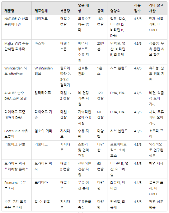 수분 공급 유지: 충분한 수분, 특히 물을 섭취하여 수분을 유지하고 모유 수유 시 우유 생산을 지원하세요.