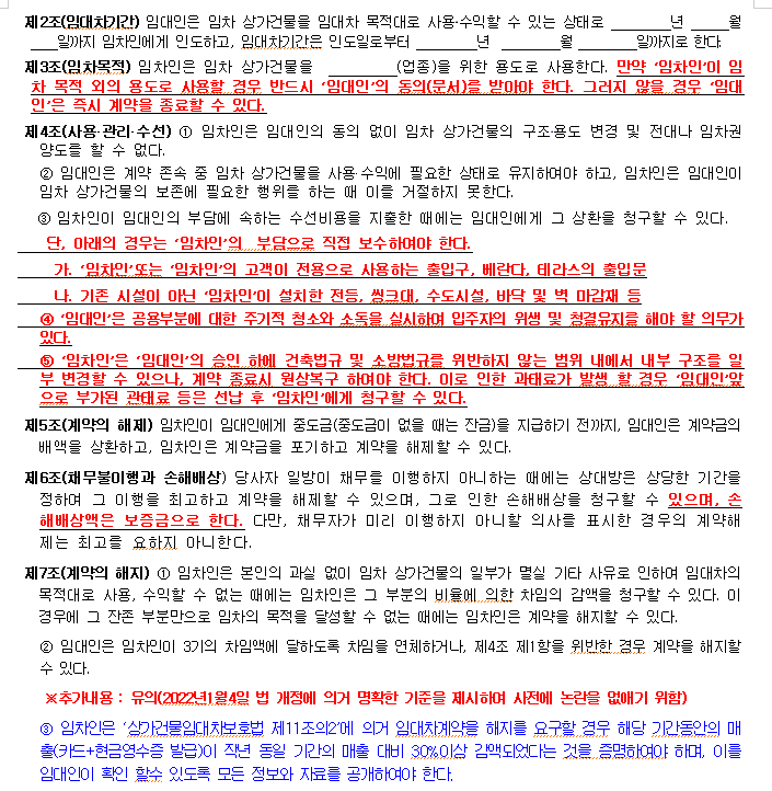 부동산이나 경험이 없는 건물관리인, 건물주 분들이 계약서는 짧고 간단할 수록 좋다고 하는 이유는 어차피 법이 있으니 법적으로 가면 아무래도 임차인들이 경재적으로 불리한 경우가 많기 때문입니다.