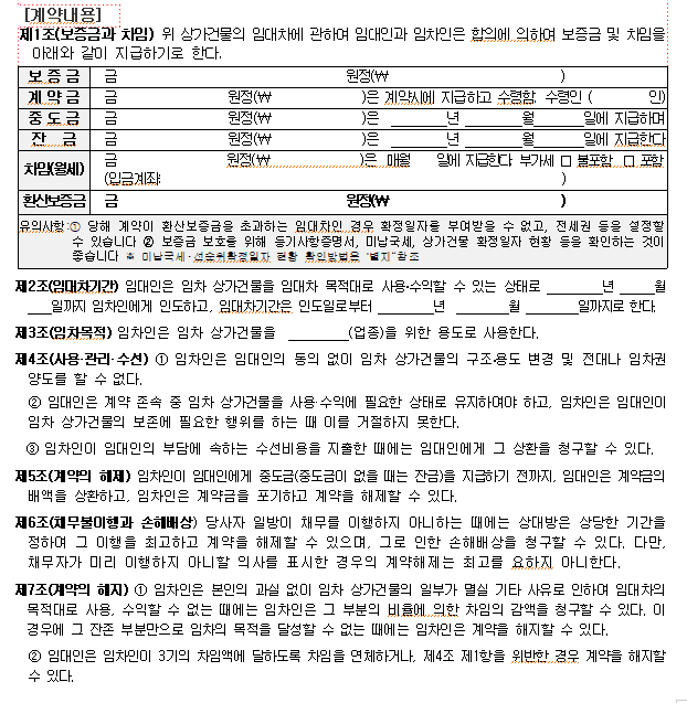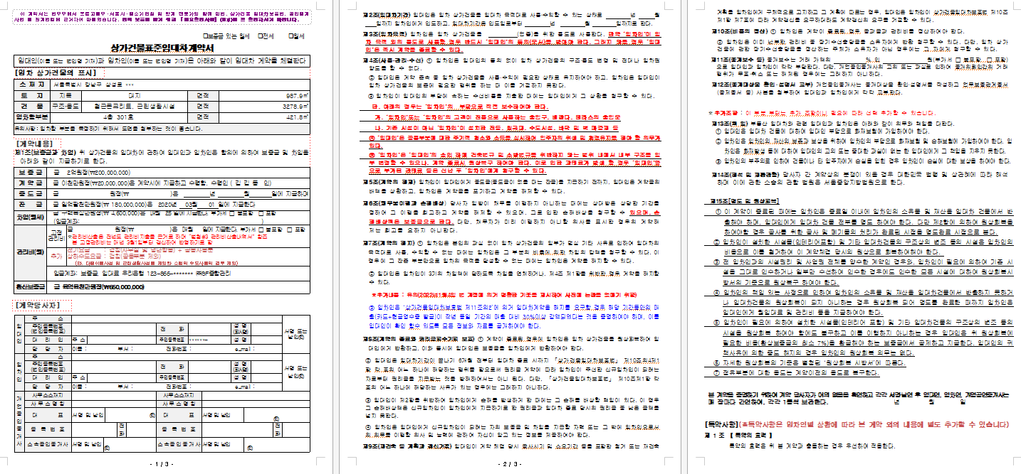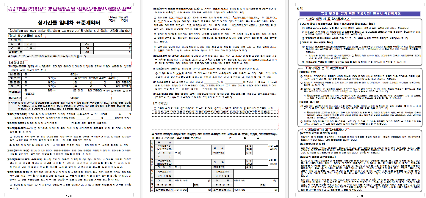 '상가건물표준임대차계약서' 표준이라고 하면 보통은 이것을 사용해야 한다고 관계자들이 주장하기도 하지만 잘못된 말입니다. 이 내용을 참고해서 최소한 계약의 행위를 인정할 수 있는 내용으로 보시면 됩니다. 따라서 이 내용을 받아서 애매한 내용은 보완하고 추가하여 법에서 세세한 사항을 명시하지 않은 부분에 대하여는 명시를 하여 이후에 발생할 수 있는 불신과 불편한 관계가 지속되지 않도록 하는 것은 부동한 임대관리에서 매우 중요한 부분임을 잊지 말아야 합니다.