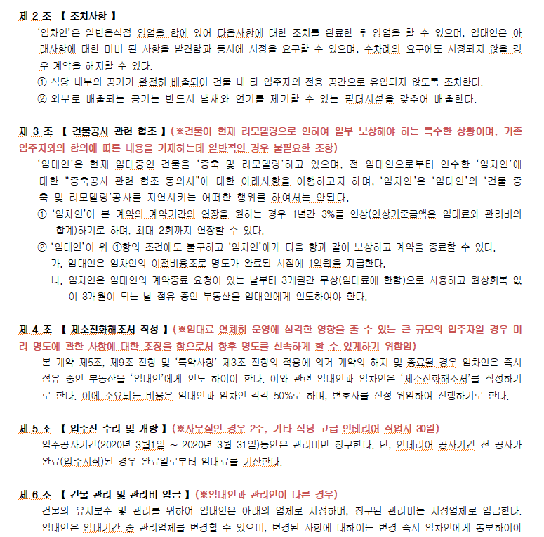 실질적으로 제가 강남에서 건물을 관리할때 사용한 임대차계약서는 임주 후 임대차계약서에 명시된 내용을 기반으로 임차인들을 상대하다가 보면 규정이 애매한 내용에 대한 임차인들과의 마찰이 거의 없었다는 것과, 건물의 공실도 10여년동안 임차인이 교체되는 짧은 기간 외에는 발생하기 않았다는 점도 시사할 점이 많습니다. 이렇게 계약서에 규정들이 상세하게 작성되어 있으면, 주변 부동산들도 부담이 많이 줄게 되어 중개성사율도 높을 수 밖에 없습니다.
