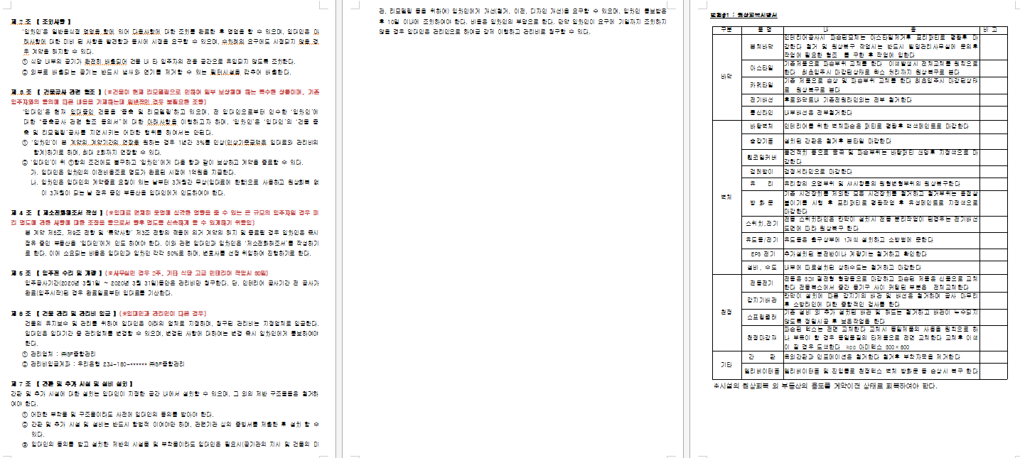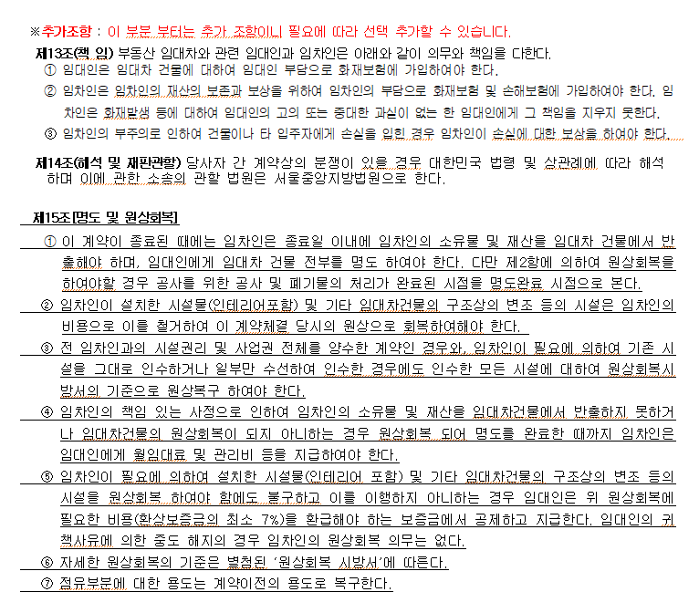 실질적으로 제가 강남에서 건물을 관리할때 사용한 임대차계약서는 임주 후 임대차계약서에 명시된 내용을 기반으로 임차인들을 상대하다가 보면 규정이 애매한 내용에 대한 임차인들과의 마찰이 거의 없었다는 것과, 건물의 공실도 10여년동안 임차인이 교체되는 짧은 기간 외에는 발생하기 않았다는 점도 시사할 점이 많습니다. 이렇게 계약서에 규정들이 상세하게 작성되어 있으면, 주변 부동산들도 부담이 많이 줄게 되어 중개성사율도 높을 수 밖에 없습니다.