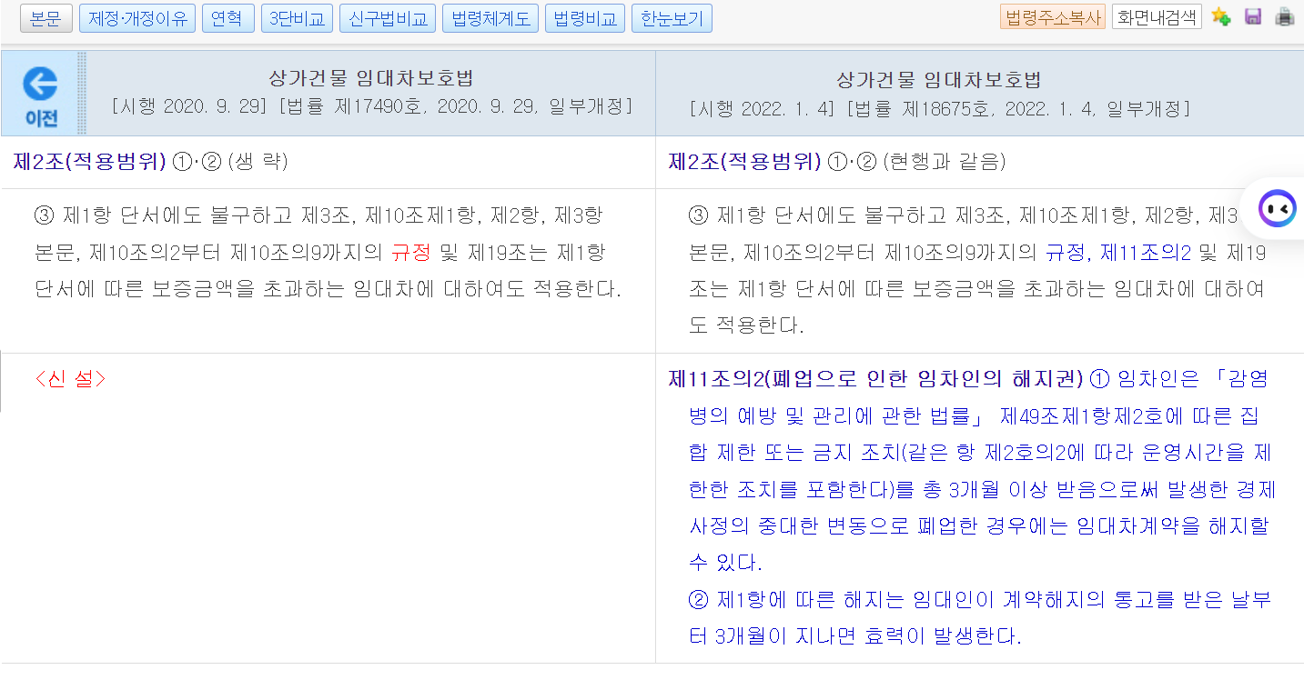 => 풀이 : 코로나 등으로 인한 법적 조치로 인한 운영시간을 총 3개월 이상 받아서 경제사정이 좋지않아 폐업한 경우는 임차인이 먼저 임대차계약을 해지 할 수 있다는 조항이 추가 되었습니다. 명확하게 기간을 3개월이지만 경제사정의 중대한 변동에 대한 규정은 포함되지 않아 논란이 될 수 있지만 일단은 임차인도 해지할 수 있는 길을 열어 두었다는 것입니다.