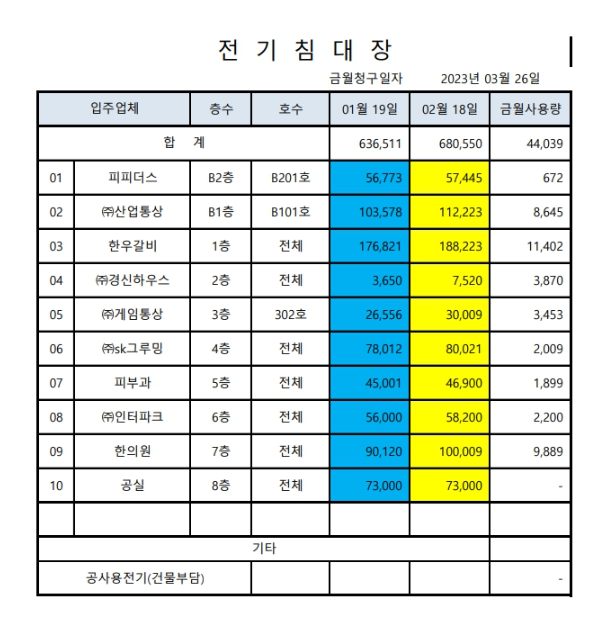 한전 고지서에 적혀 있는 사용량 - 각입주자의 전기사용량의 총합 = 공용전기사용량