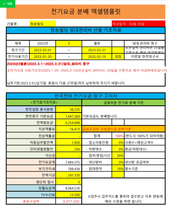 중소형건물 전기요금 분배 엑셀 템플릿 - 크몽