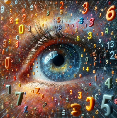The image would feature a close-up of a human eye, with a vibrant and complex background filled with an array of floating numbers in various sizes and colors, creating a sense of depth and movement. Some numbers would be more prominent, while others might be fading or subtly changing, to hint at the interactive aspect where a viewer would focus on a specific number. The focal point would be on one number that appears to be in the process of disappearing or changing, drawing the viewer's attention and highlighting the challenge of maintaining focus amidst a changing visual field. This depiction would aim to capture the viewer's curiosity and evoke the feeling of engaging in a mental exercise that tests and enhances concentration and visual tracking abilities.
