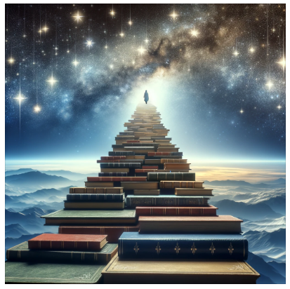 이미지 설명 : 위의 이미지는 "인생 여정에서, 각각의 책은 더 높은 곳으로 가는 디딤돌이다. 지혜의 말을 따라 올라가며 별들을 향해 계속 걸어가라."라는 명언의 정신을 시각적으로 표현하고 있습니다. 이 장면은 책으로 만들어진 계단이 별들을 향해 올라가는 모습을 보여주며, 지식의 여정과 지혜, 개인적 성장, 그리고 야망의 길을 상징합니다. 이미지는 열망, 성장, 그리고 지혜 추구가 인생에서의 지도적인 힘을 나타내는 것을 전달합니다.