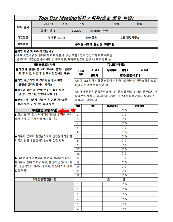 2) 작업반별 진행 : 안전관련, 작업방법, 준비사항, 불안전요소제거방법,기타 공지사항 등