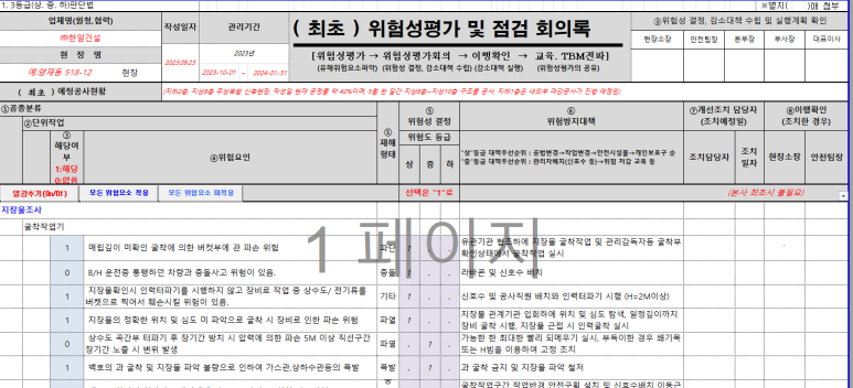 -최초위험성평가 서작성: 현장개설 후 1개월내에 모든 공종에 대한 위험요소 파악, 조치방법, 저감조치 등을 기록한다.