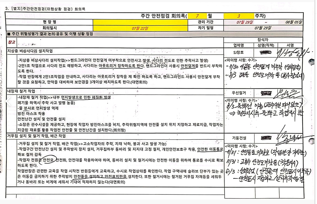 작업 1주전에 예측되는 위험요소에 대한 구체적 위험요서 저감 조치 및 대처에 관하여 모든 공종 관련자들이 모여 회의 실시 후 기록(주간안전점검 회의록)