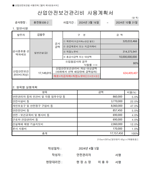 -산업안전보건관리비는 법으로 정해진 비율이 공사금액에서 배정이 되어야 합니다. 내부적 서류와 별도로 반드시 규정을 준수하여 작성하여야 합니다.