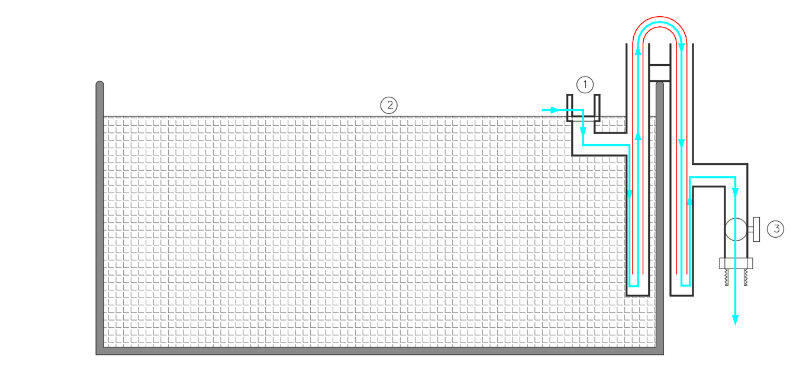 이미지에서 빨강색의 "U" 자형 파이프 관은 사이펀기능을 활용한 오버 플로우 방지에서 가장 중요한 부분입니다.