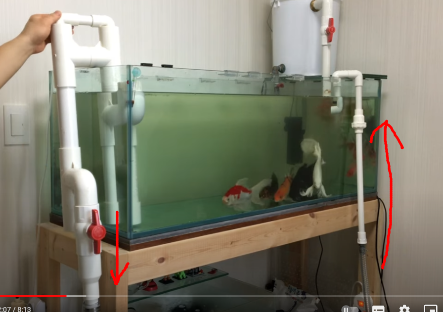 오른쪽의 배관에서는 섬프어항에서 펌프를 통하여 어항으로 물이 올려 집니다.