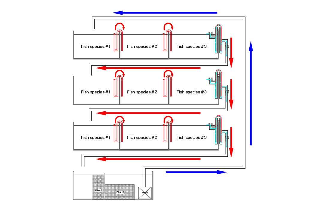 물 순환: 이 시스템은 중앙 집중식 여과 시스템을 통해 지속적인 물 순환 방식을 사용합니다. 다이어그램의 파란색 화살표는 모든 탱크에 순환되어 일관된 수질을 보장하는 물의 흐름을 나타냅니다.