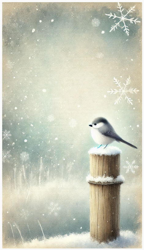 눈 덮인 나무 기둥 위에 앉아 있는 작은 새가 특징인