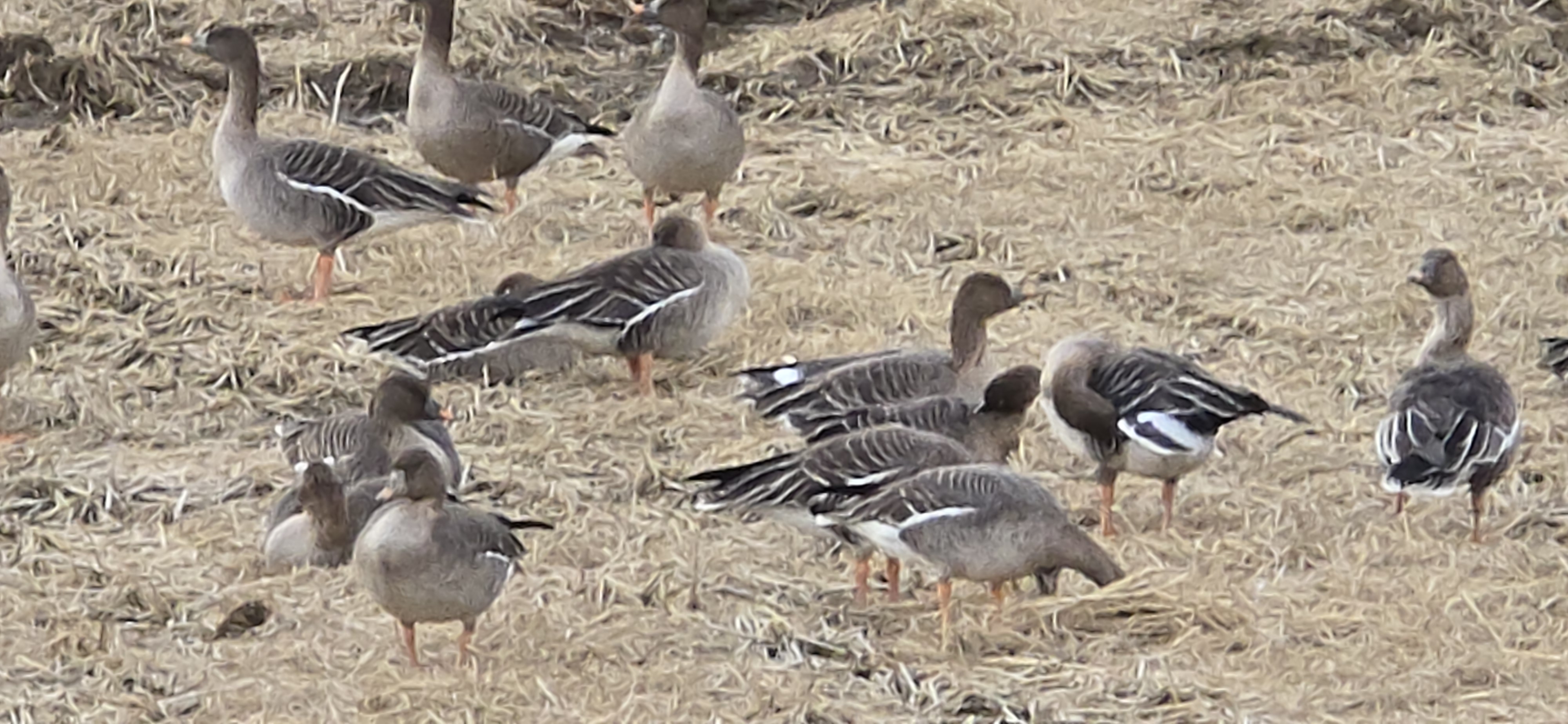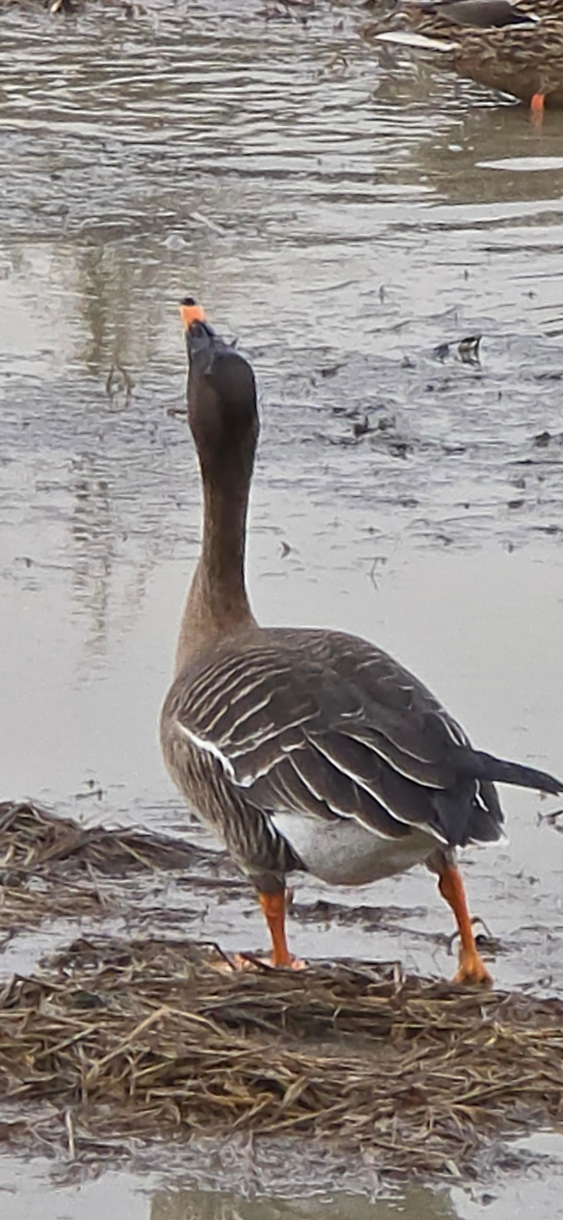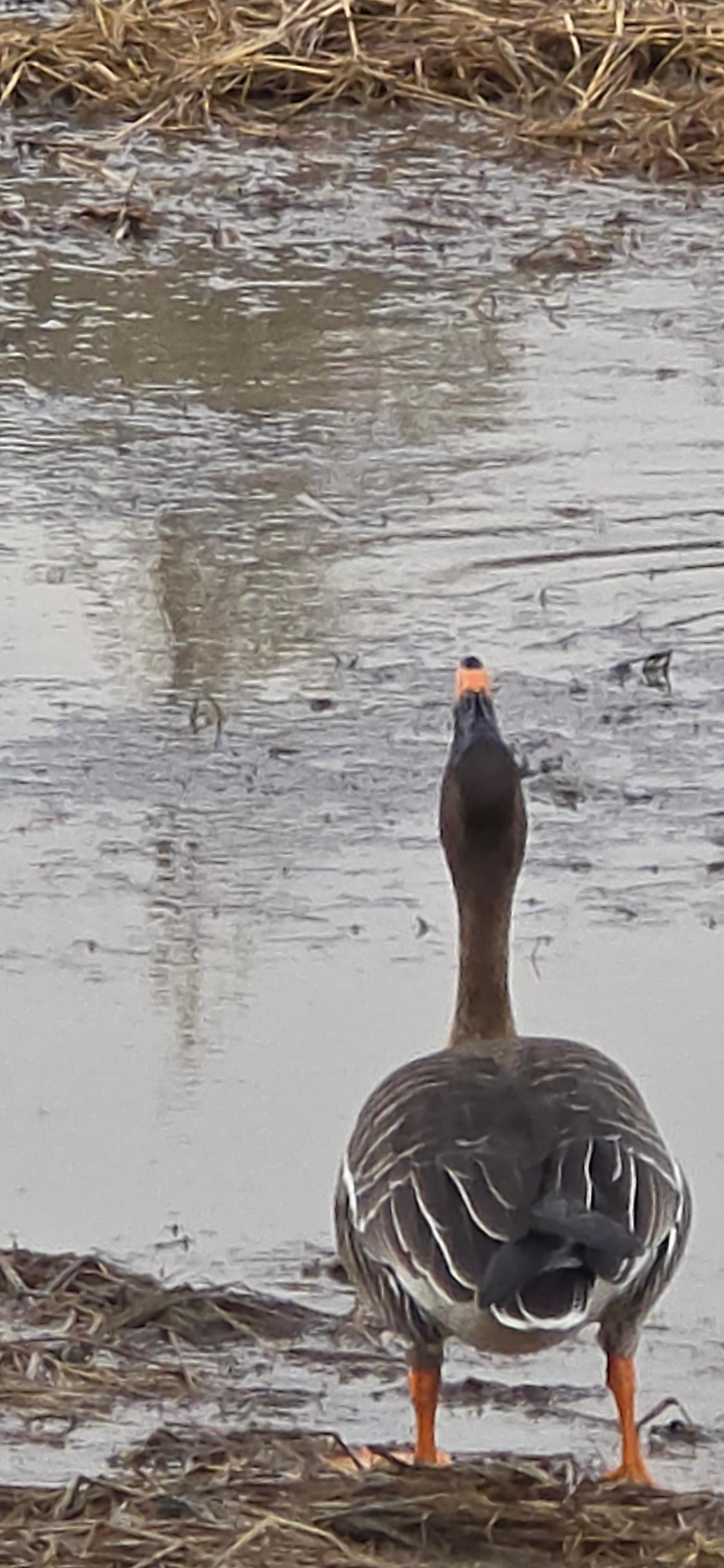 이 사진은 겨울철 산책 중 찍은 큰기러기(Anser albifrons)의 모습으로 보입니다. 큰기러기는 겨울철 한국에 주로 서식하는 철새로, 다음과 같은 특징이 있습니다: