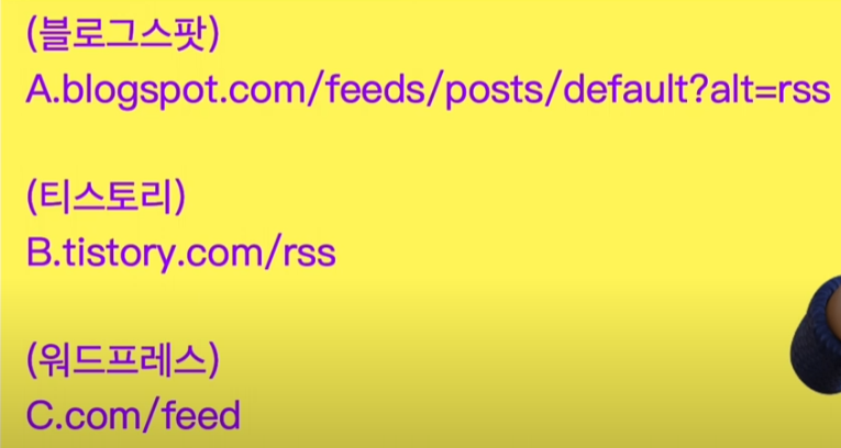 즉 티스토리의 경우는 URL뒤에 "/rss"를 붙이지만 워드프레스의 경우는 "/feed"를 붙이게 된다는 사실을 알고 계셔야 합니다.