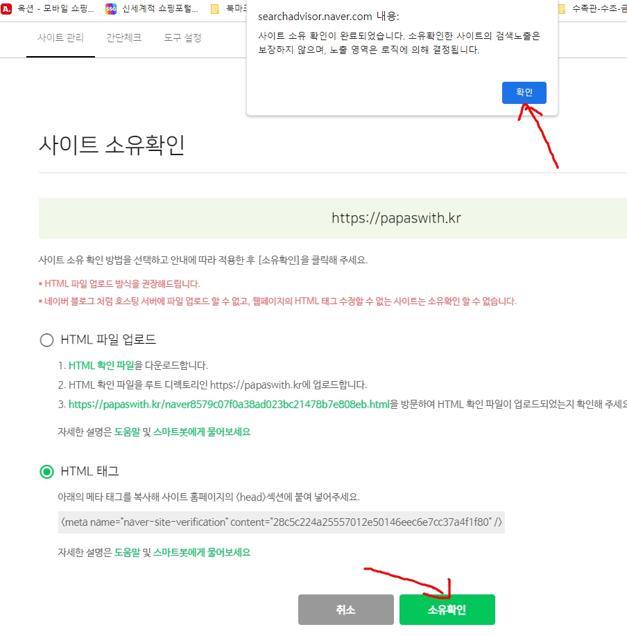 사이트 소유를 확인하기 위하여는 다음의 두 가지 방식이 있습니다.