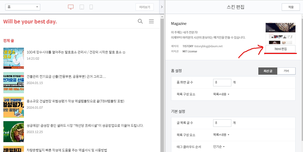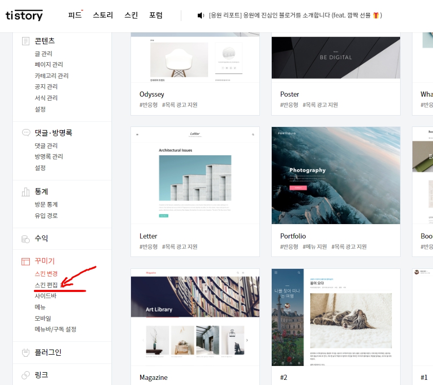 편집방법은 티스토리 블로그 관리 페이지로 가셔서