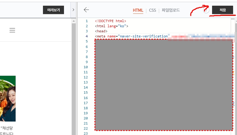 <head> 아랫부분에 복사한 내용을 삽입하고 "적용"을 클릭합니다.
