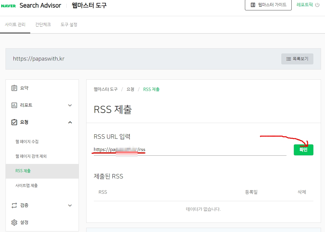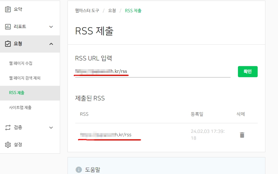 이렇게 하여 "확인"버튼을 누르면 네이버 인증을 거친 후 아래와 같이 RSS제출이 완성됩니다.
