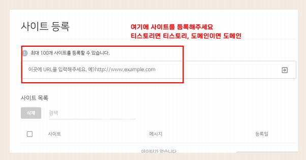 이제 안내 되는 것 처럼 여러분들의 사이트 주소를 입력해 보세요.